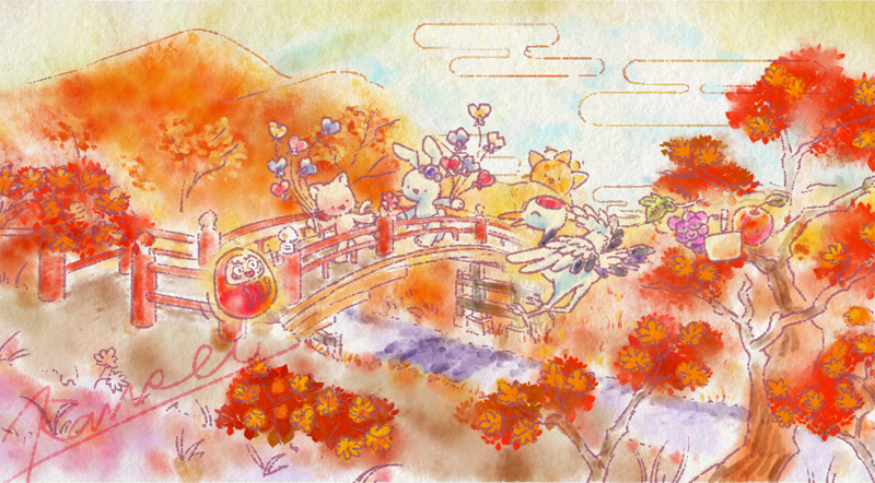 #群馬県民の日 記念セール用に描いたイラスト~ ルクちゃんとリシュくんがハートバルーンで群馬に遊びに来た体! 10/28(秋)なので紅葉が美しい観光名所…というわけで、真ん中の橋は「河鹿橋」をイメージ。 (Steamのパブリッシャーページのヘッダーイラストなので上下がめっちゃ切れる。) pic.x.com/8DDerrpZ80 x.com/RucKy_info/sta…
