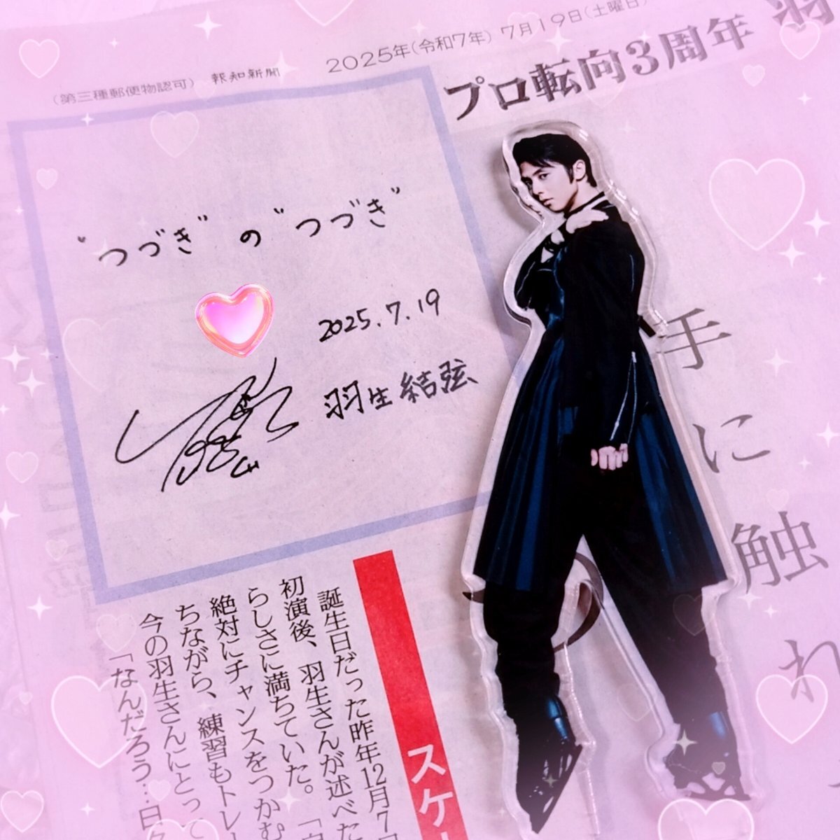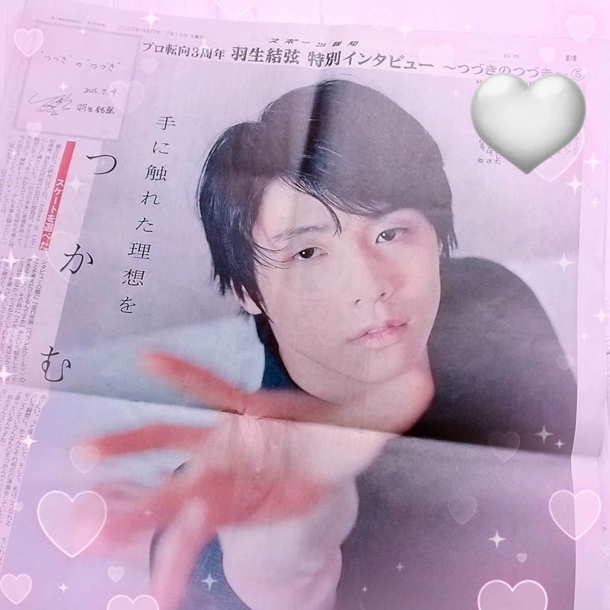 ふふふ♡(ㅅ•᎑•)♡*.+゜ 報知の羽生くん、ドアップ!! 最強カッコよくて綺麗で、お昼に買えました🤗💖 羽生くんの字、“つづき” の“つづき” 【2025. 7. 19】まで書いてくれてて きれいな字まで愛しい✨✨✨ 羽生くん❤️本当にありがとう❤️ #羽生結弦さんプロ3周年おめでとう #Yuzuru3rdProversary pic.x.com/tIllYmOFky