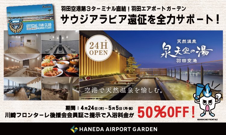 🔥【アジア青覇へ!期間限定応援企画!】🔥 川崎フロンターレ後援会会員証(2025シーズン)ご提示で、 クラブパートナーである #羽田エアポートガーデン 内の #泉天空の湯 入浴料金が50%OFF!♨ 通常、会員証提示で800円引きのところ、期間限定でさらにお得に。 pic.x.com/2nAMKJjq7v