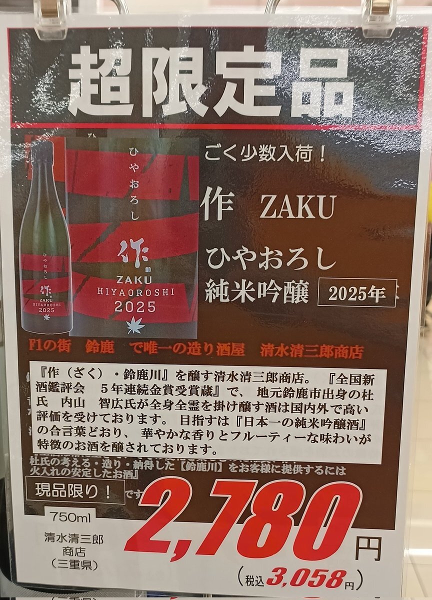ジャパンミート卸売市場 越谷店に行きました 酒を買うのです 作(ざく)ひやおろし純米吟醸 少々お高い値段だけど季節モノなので奮発しました 作(ざく)を作ってる清水清三郎商店と私が最も大好きな京都北山の羽田酒造は社長さん同士が仲がいいみたいなんですよ #作 #清水清三郎商店 #羽田酒造 x.com/Kn1kwhrT/statu…