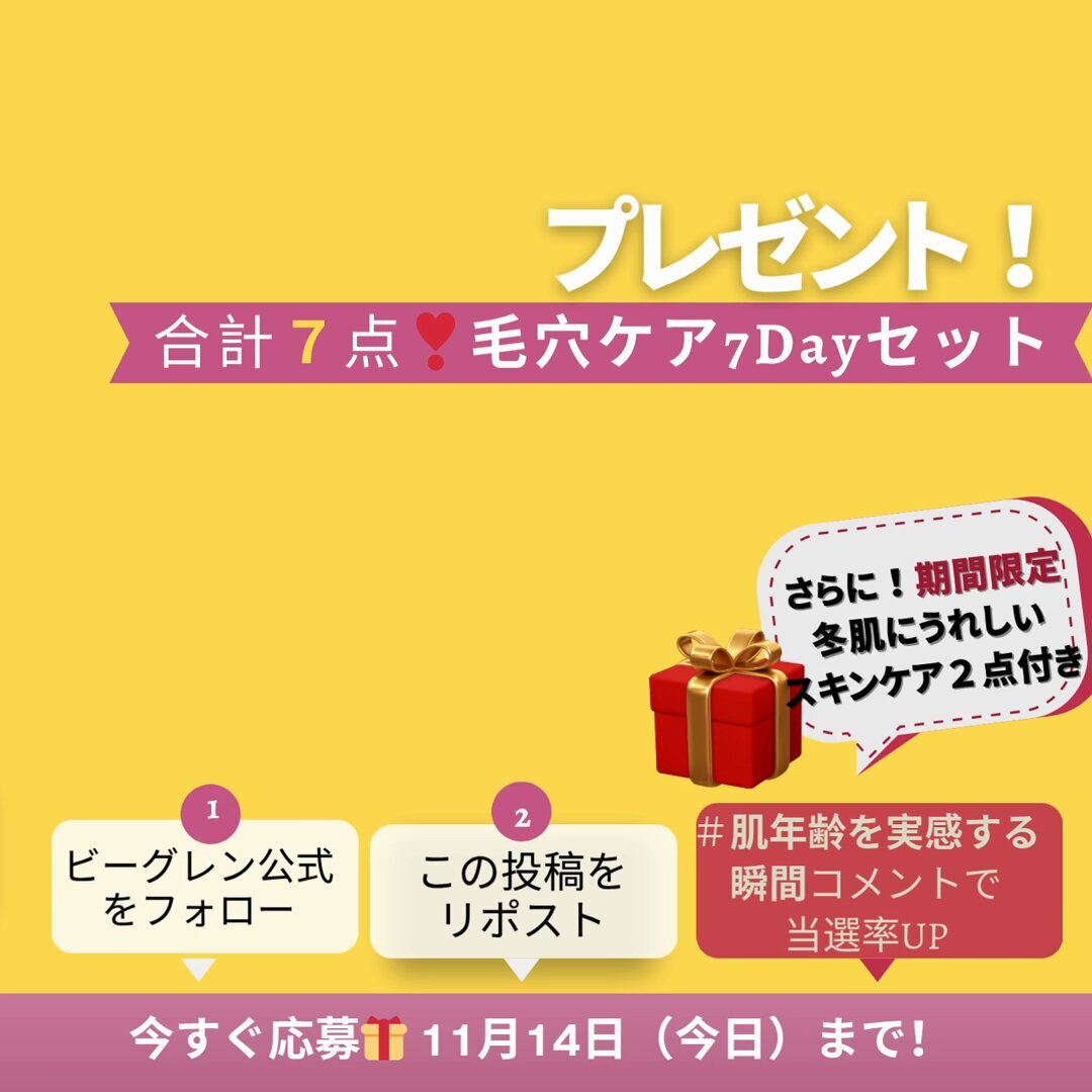 #ビーグレン の #毛穴ケア7Dayセット 🎁応募は今日が最後! 今回は抽選で10名様にお届け💌 「数日で感触が全然違う!」と うれしい声も続々✨ フォロー&リポストで応募完了! 「#肌年齢を感じる瞬間」をコメントで当選率UP💬 お待ちしてます💎 #エイジングケア #スキンケア #キャンペーン