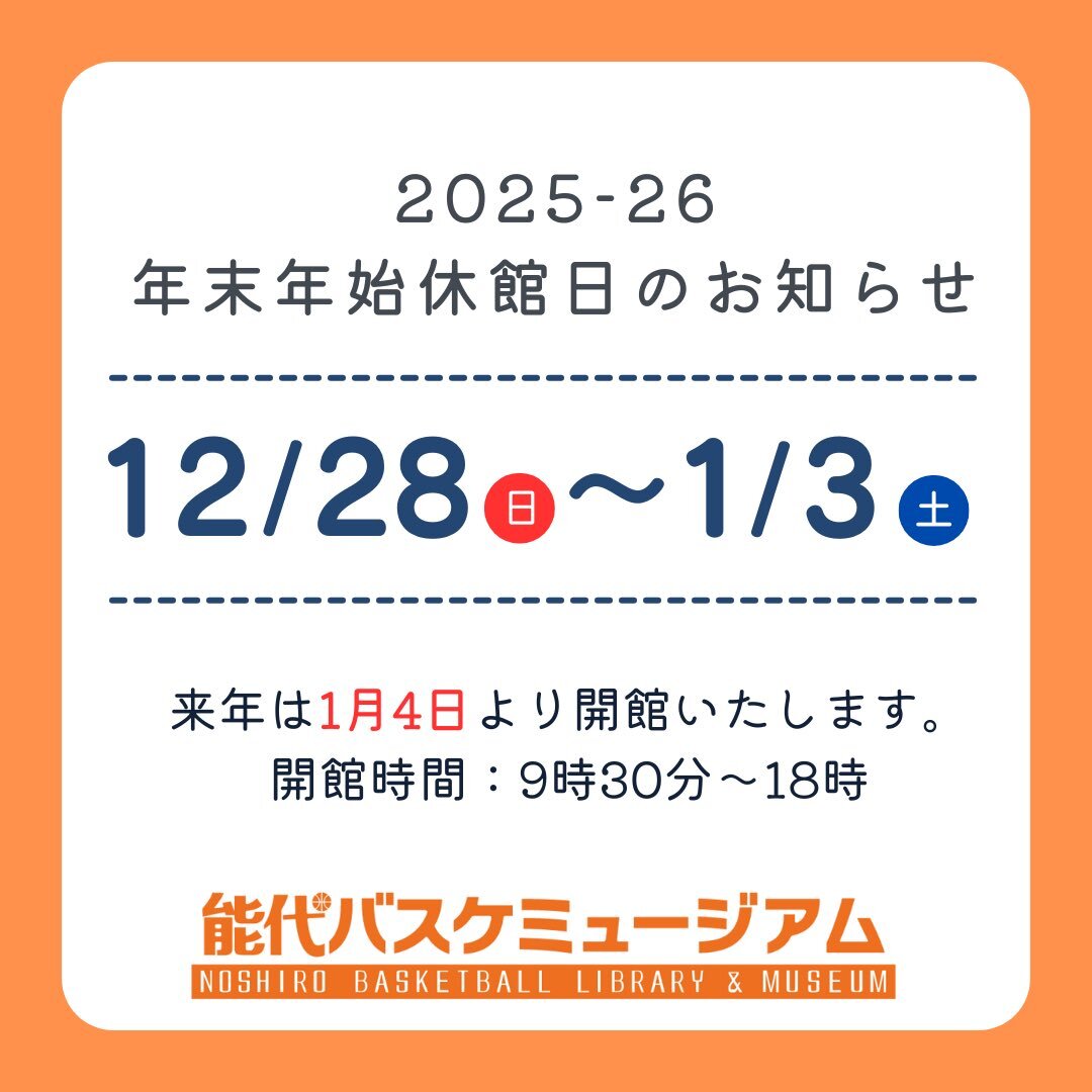 【2025-26年末年始のお知らせ📢】 12/28日から1/3日まで休館となりますので、ご了承ください🙇‍♀️ 1/4日から通常どおり(9時30分〜18時)開館いたします。 皆さまのご来館お待ちしています☺️ #能代科技 #能代工高 #バスケの街能代 pic.x.com/c2vH7UfFIM
