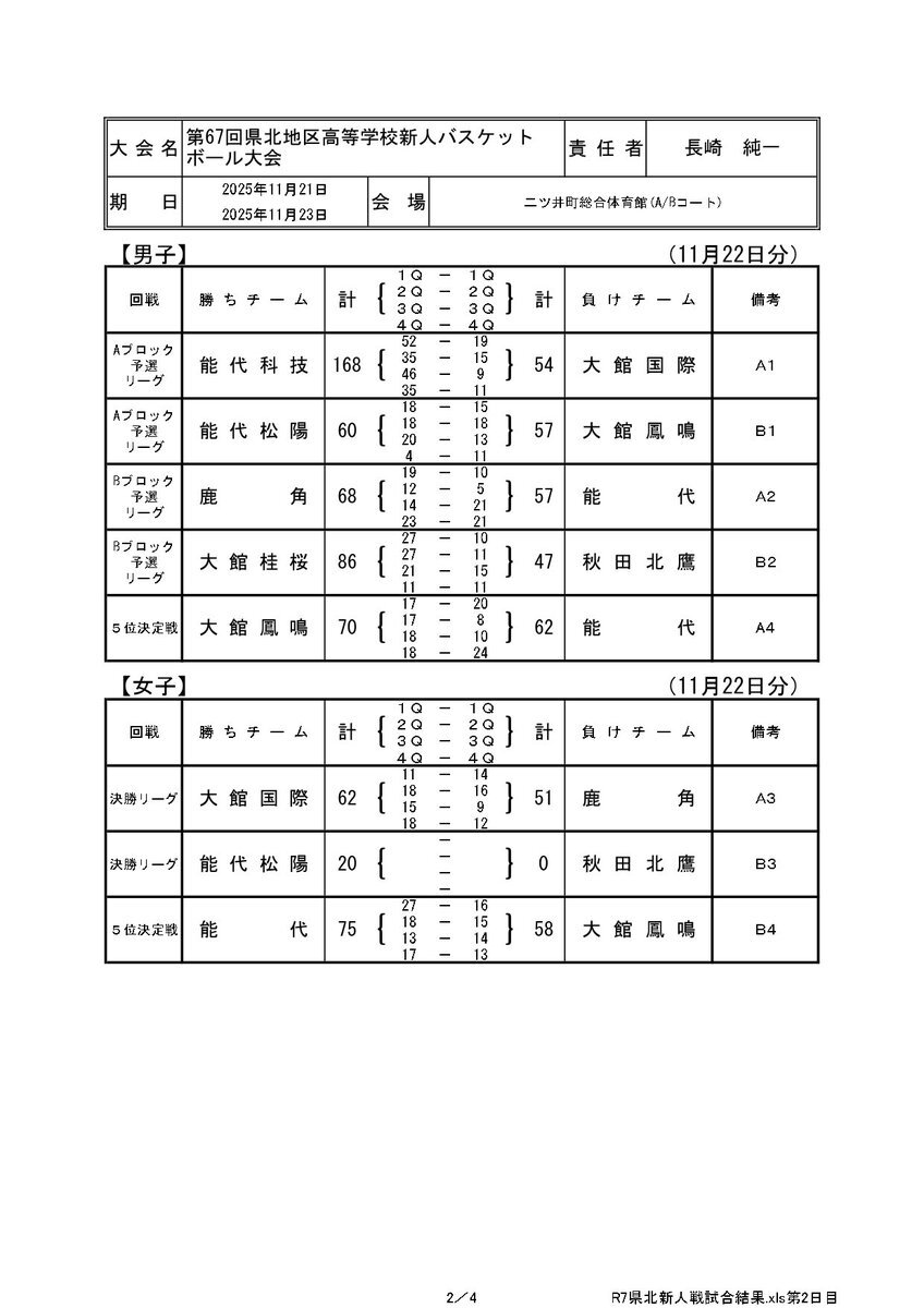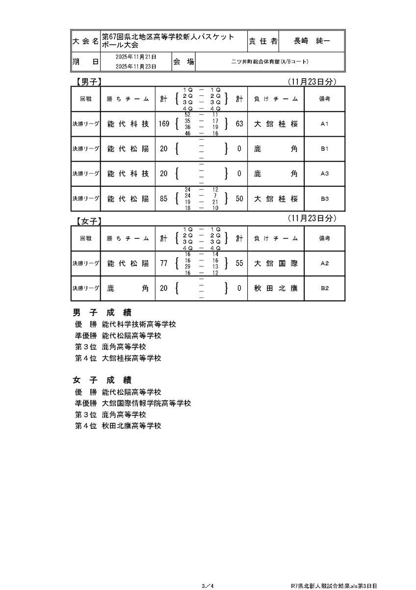 【県北地区高校新人大会⛹️‍♂️】 2日目の結果です。 最終日(11/23日)は、男女決勝リーグが行われます。 ⛹️‍♂️能代科技の試合は以下のとおり。 9時30分🆚大館桂桜 13時🆚鹿角 明日も応援よろしくお願いします! #高校バスケ #能代科技 pic.x.com/r2SIC0lQBo