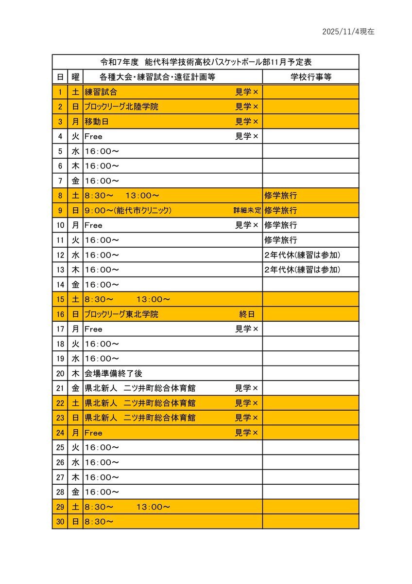 #能代科技 バスケ部への応援いつもありがとうございます! 11月の練習予定表です。写真・動画撮影や練習内容をSNSへアップするのはご遠慮ください🙇‍♀️ 16日は #U18日清食品ブロックリーグ2025🆚東北学院 、21〜23日は県北新人が開催されます⛹️‍♂️ 応援よろしくお願いします📣 #バスケの街能代 pic.x.com/oLHjzMwEa1