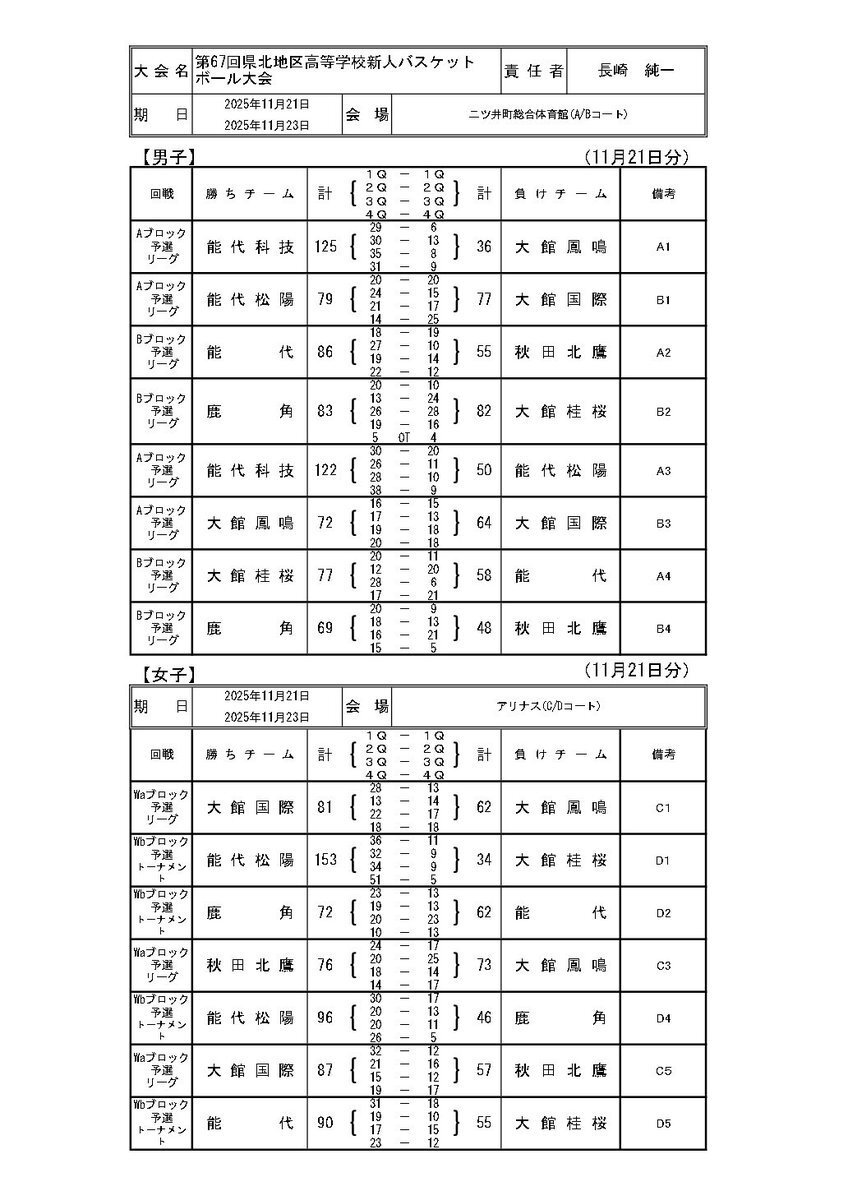 【県北地区高校新人大会⛹️‍♂️】 初日の結果です。 明日(11/22日)は、男子予選リーグ、女子決勝リーグ、男女5位決定戦が行われます。 #高校バスケ #能代科技 pic.x.com/CnPm66yKQK