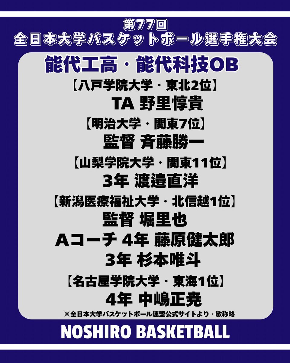 全日本バスケットボール選手権大会(#インカレバスケ)が11/29日開幕! #能代工高#能代科技 OBも出場⛹️‍♂️公式サイトに掲載された選手以外にも出場校に所属している選手もいます! 【日本体育大学】 3年髙橋輝 【山梨学院大学】 2年関口創介 【東海大学】 2年佐藤楓生 応援よろしくお願いします📣 pic.x.com/L9KlIAY0fp