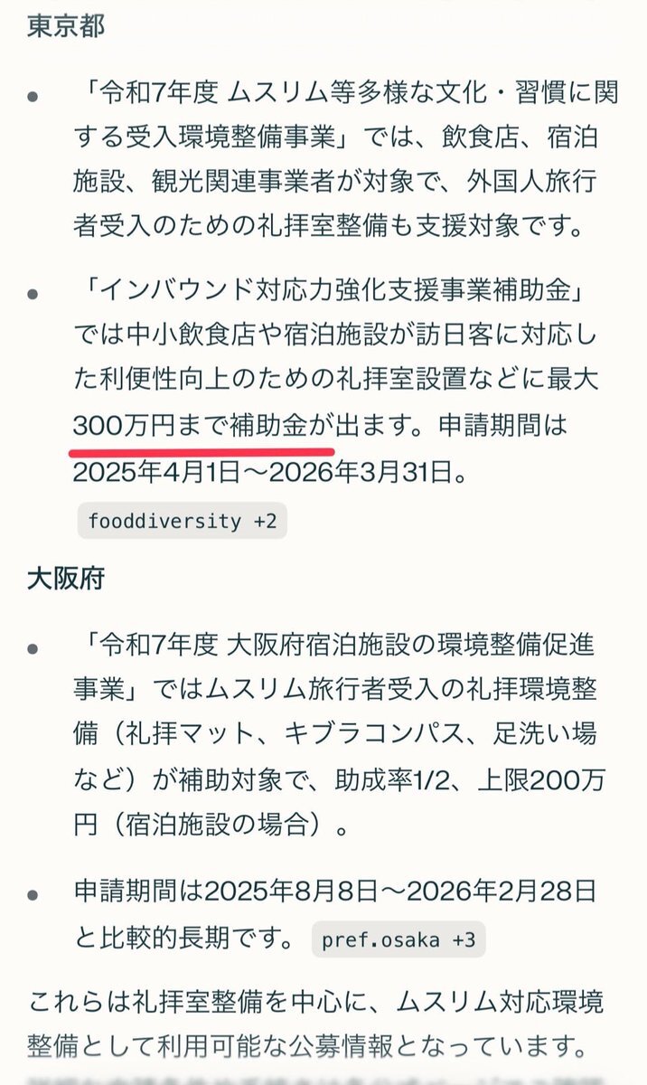 「観光庁はムスリム旅行者受入環境整備に役8,000万円使い礼拝室や足洗い場の設置を支援 現在も東京都は最大300万円大阪府は200万円の補助制度を実施」 『ムスリムの補助今すぐやめろ』 と思う方! いいね👍お願いします!