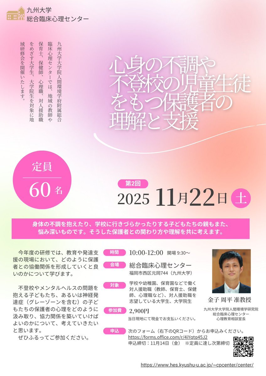 2025年11月22日(土)10:00〜12:00、九州大学の総合臨床心理センター「心身の不調や不登校の児童生徒をもつ保護者の理解と支援」の参加申し込みが、明後日に迫ってきました。ご検討中の方はお誘い合わせの上、是非お申し込みください。#カウンセリング #臨床心理学 #不登校 hes.kyushu-u.ac.jp/~ccphd/graduat…