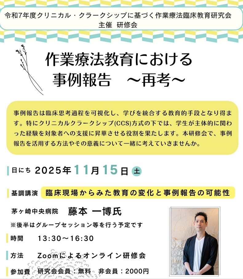 学生の学びと臨床家の学び、どちらも大切。 「事例報告」を再考することで見える新しい教育のかたち。 📆11/15(土)オンライン 🔗 ccs-ot-education.kenkyuukai.jp #作業療法 #臨床教育 #本音で語る pic.x.com/O824WPaxxm