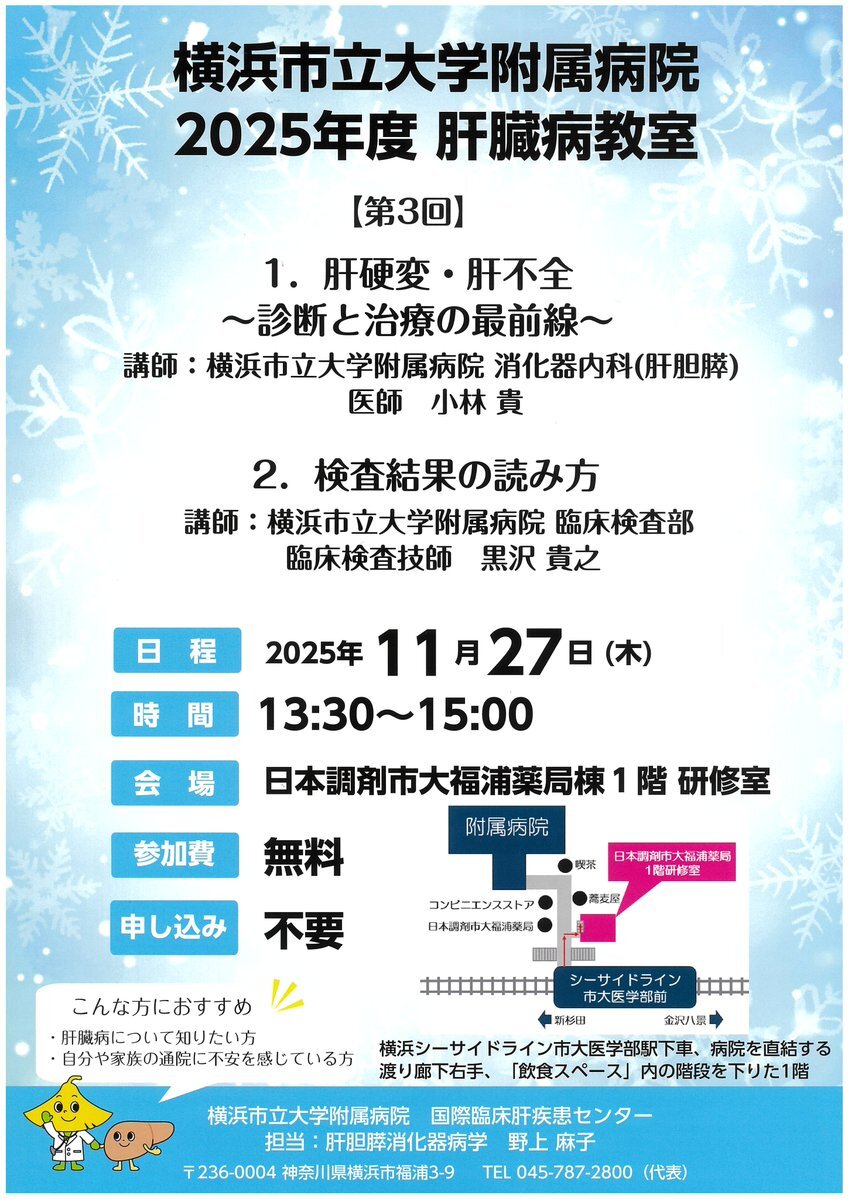 📌肝臓病教室 今年度3回目の #肝臓病教室 のお知らせです。 今回のテーマは #肝硬変 #肝不全 です。今回は、検査結果の読み方について #臨床検査技師 からのお話もあります。 ぜひ、お気軽にご参加ください!! @YCU_LiverCenter #Liver #肝臓 pic.x.com/ujRQ8vdZ8d