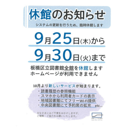 【9月休館のお知らせ】 9月25日(木)から30日(火)まで、システム更新のため板橋区立図書館全館で臨時休館いたします。 また、上記期間中HPの利用もできません。 ご理解、ご協力賜りますようお願い申し上げます。 #板橋区 #東板橋図書館 #臨時休館 pic.x.com/2888bX7uJF