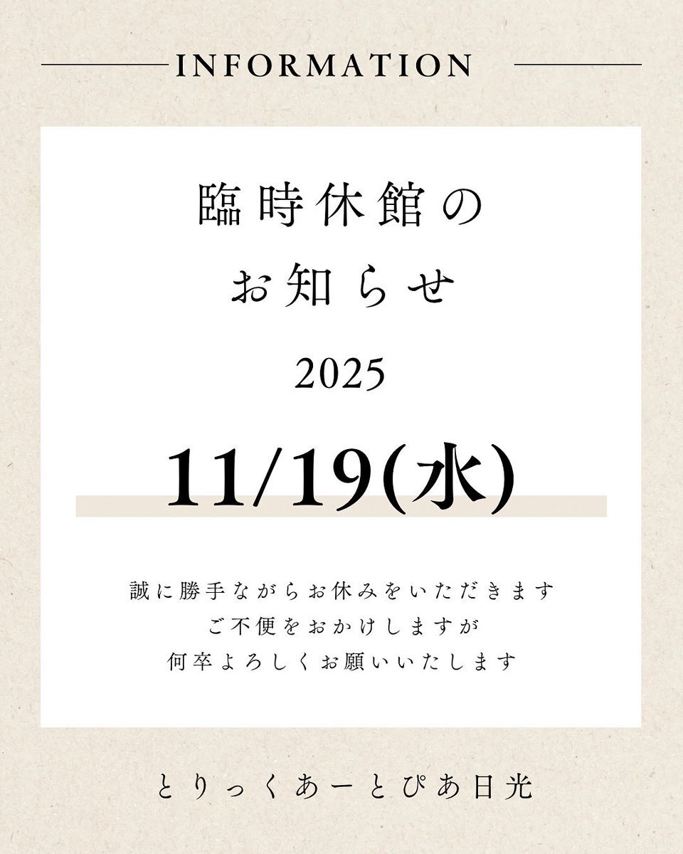 ⭐️臨時休館のおしらせ⭐️ 2025年11月19日(水)は 終日休館とさせていただきます。 何卒ご理解のほど、お願い申し上げます。 ※翌20日(木)より通常通り営業いたします。 #とりっくあーとぴあ日光 #日光 #鬼怒川 #trickart #お知らせ #臨時休館 #美術館 #鬼怒川観光 pic.x.com/ms1JgT3Raj