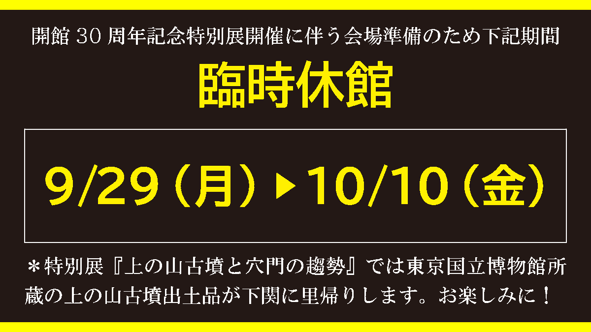 9/29(月)~10/10(金)まで、#特別展 の会場準備のため、#臨時休館 します。 開館30周年を #記念 する特別展なので、開催をお楽しみに♪会期は10/11(土)~12/7(日)です。 shimo-kouko.jp/planning/speci… 会期中の関連 #イベント の中にはすでに受付を開始しているものもあるので興味のある方はお早めに✅ pic.x.com/8UzLSXAPfd