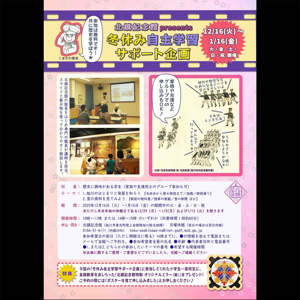 #北鎮記念館 では、12/16(火)~1/16(金)に「#冬休み #自主学習 サポート企画」を開催します。 対象は学生で、家族や友達同士のグループ参加も可。(1)「旭川のはじまりと発展」(2)「戦前の教科書など昔の資料を学ぶ」のいずれかのテーマを無料で学べます。 お問い合わせとご予約は当館まで。 pic.x.com/WGIQdPdAdY