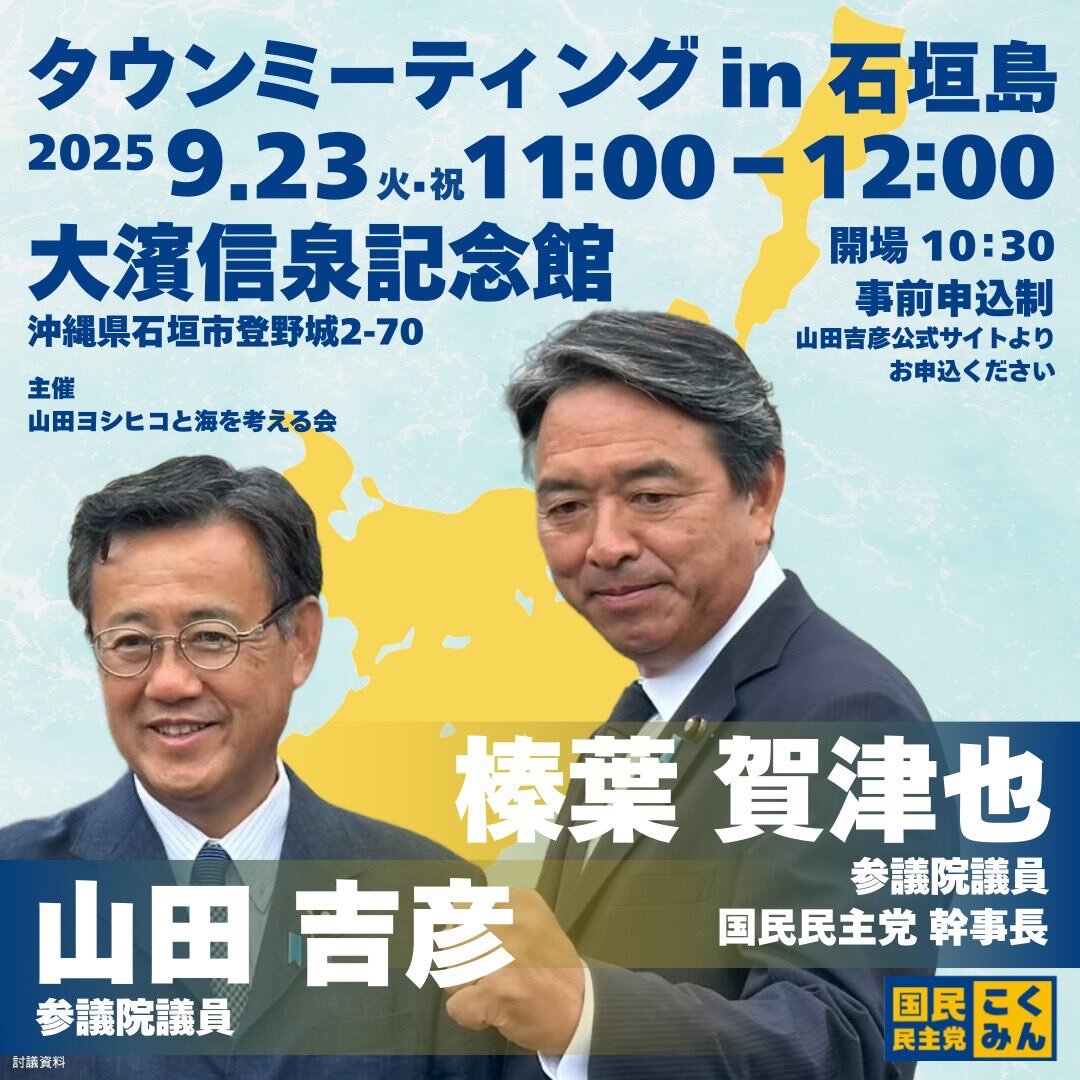 本日、榛葉賀津也幹事長と山田ヨシヒコのタウンミーティングin石垣島。ぜひ御覧ください。 youtube.com/live/ZdgR7uf4J…