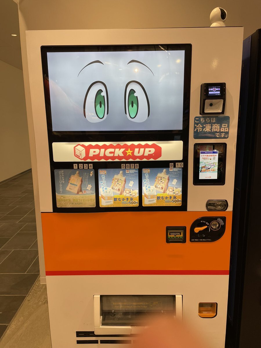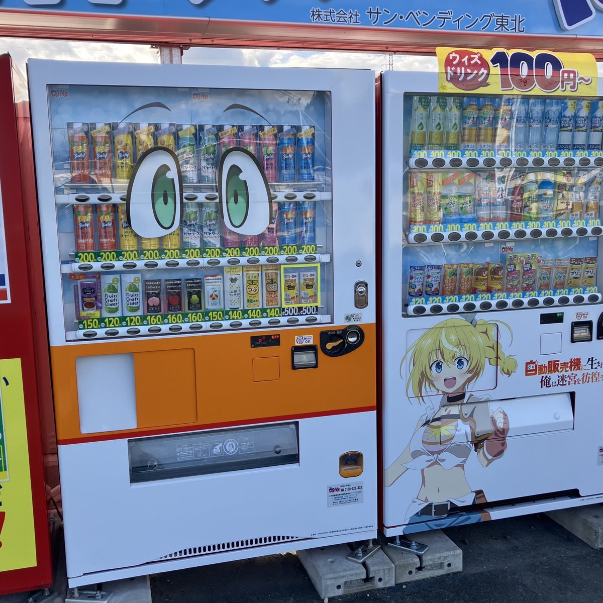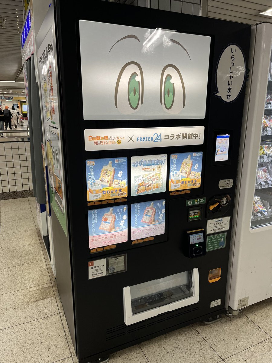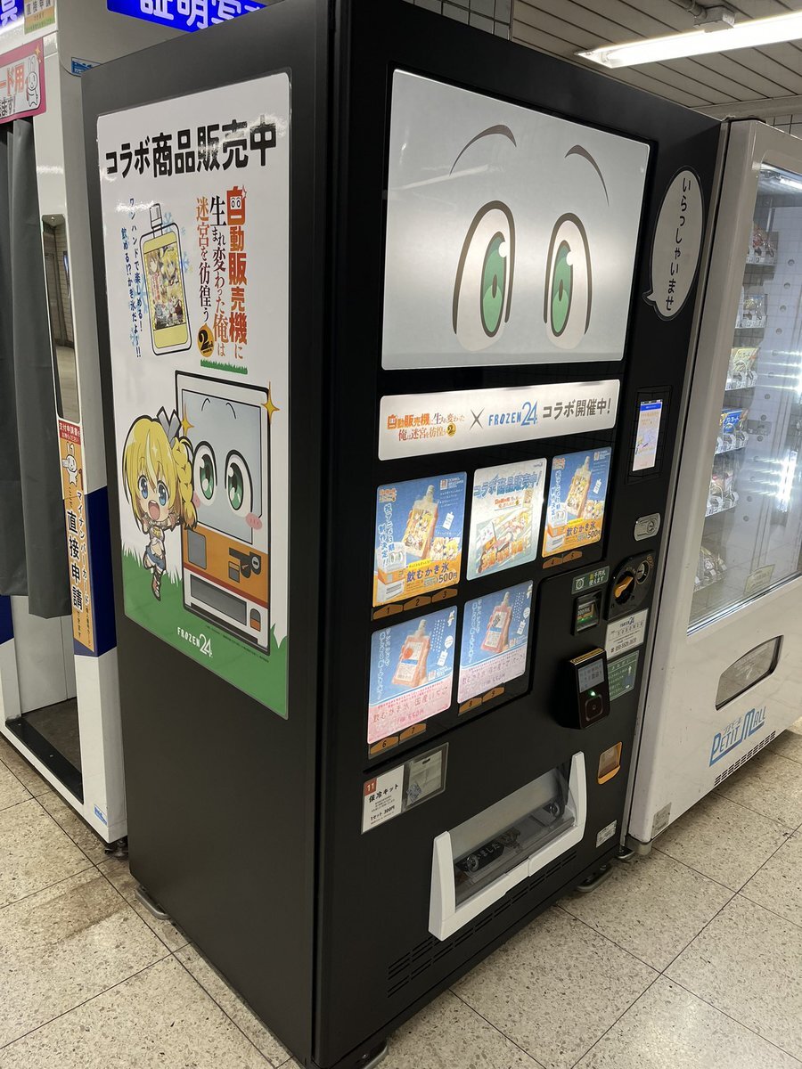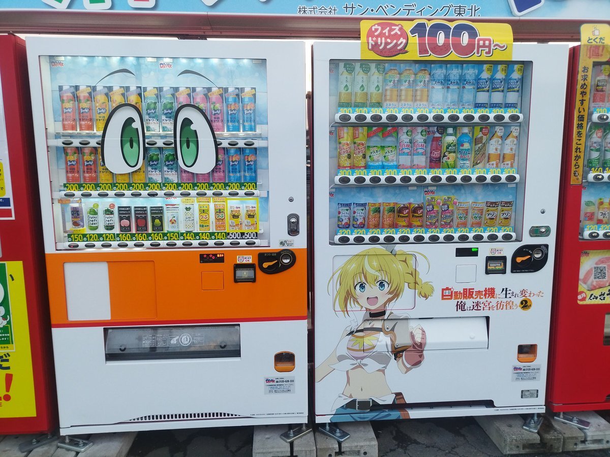 目玉がついてるのがアニメ「#自動販売機に生まれ変わった俺は迷宮を彷徨う」とコラボした自販機。 まぁ機能的にはアニメのキャラと同じ声が出るだけなんだけど😅 何か買ってみようと思ったら、見たことがない飲み物がオススメになってたので買ってみた😆 pic.x.com/QGErINB80x