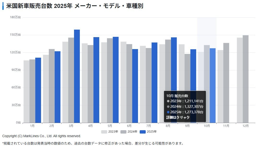 米国新車販売台数 2025年 メーカー・モデル・車種別 marklines.com/ja/statistics/… 米国の10月の乗用車・小型トラック販売 5.1%減の127.3万台 「販売台数」の深掘りは下記リンクをご覧ください marklines.com/ja/automotive-… #自動車販売台数 #新車販売 #車種別新車販売 #マークラインズ #自動車産業レポート pic.x.com/0E10I1M9O7