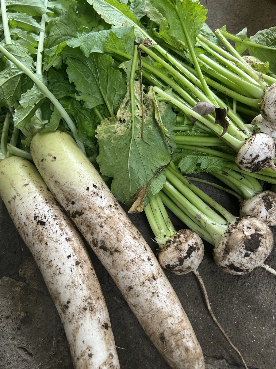自家栽培の野菜 「大根、かぶ、いんげん、ふゆな」 「ふゆな」はこの数馬地域で昔から続いているお野菜です。苦みと甘みが美味しい! #檜原村 #自家栽培 #ふゆな pic.x.com/OH105LCAPW