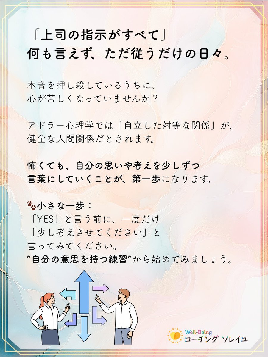 上司の顔色ばかり気にして、自分の意見が言えなくなっていませんか? #アドラー心理学 #職場の悩み #自己主張 #HSP pic.x.com/pUpNeQwjFQ