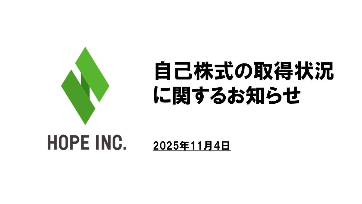 #お知らせ】 本日、以下のお知らせを開示いたしました。 ■自己株式の取得状況に関するお知らせ ssl4.eir-parts.net/doc/6195/tdnet… #株式会社ホープ #証券コード6195 #HOPE #IR #自己株式取得 pic.x.com/3T8pz3sGLO