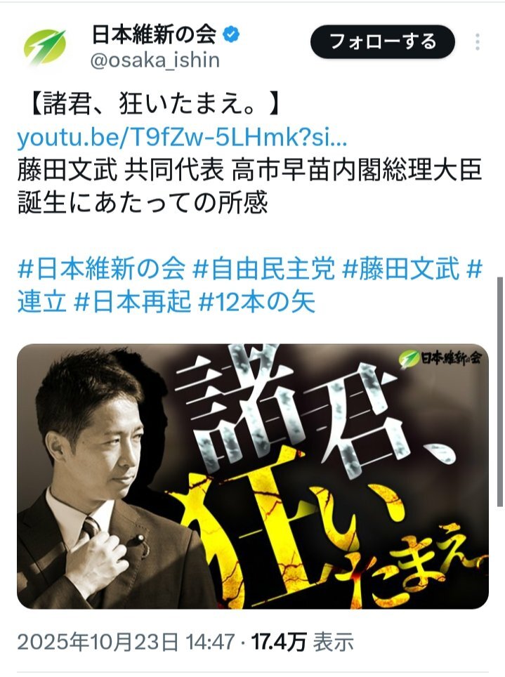 返信先:@hiroyoshimura日本人を滅ぼす方針が明確ですね。 カルトと売国奴のコラボが織りなす国家滅亡のハーモニー。 2人の言ってることが矛盾してること分かってないの? #万博未払い問題 から逃げるために、散々目の敵にしていた自民党と連立して好き勝手やってるんですか? 恐ろしいですね。 #自民と維新に殺される pic.x.com/T9MjrUrJFk