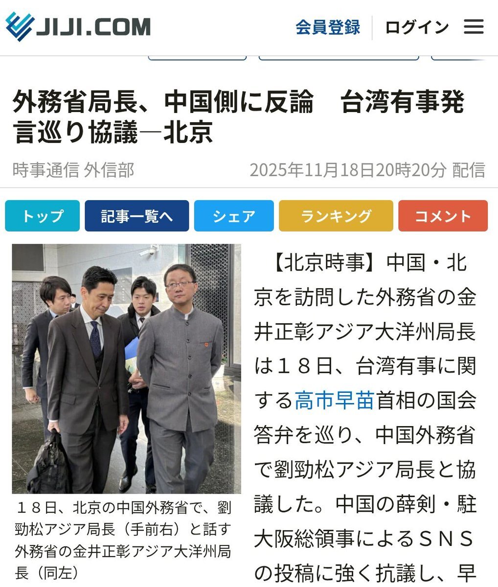 返信先:@Sankei_news#いやそのりくつはおかしい 「高市の部下でございます。 このたびは誠に遺憾なことで……」 (@∀@)つ【現実】 ≫外務省幹部が中国へ出発 「台湾有事」総理発言巡り news.yahoo.co.jp/articles/d27f0… #ファクトチェック #自民党から自由主義社会を守れ #オタクだからこそ軍事優先の政治に反対します pic.x.com/jSih8Gp9GP