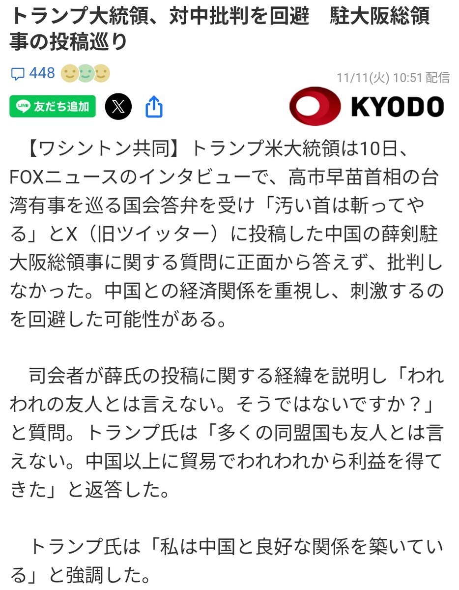 返信先:@michihikofujiei#いやそのりくつはおかしい 高市早苗としては「アメリカの忠犬」を演じたつもりのイキり愛国ムーブだったと思うよ(@∀@) ところがトランプにハシゴはずされて宙に舞う羽目にwww jiji.com/sp/article?k=2… #自民党から自由主義社会を守れ #オタクだからこそ軍事優先の政治に反対します