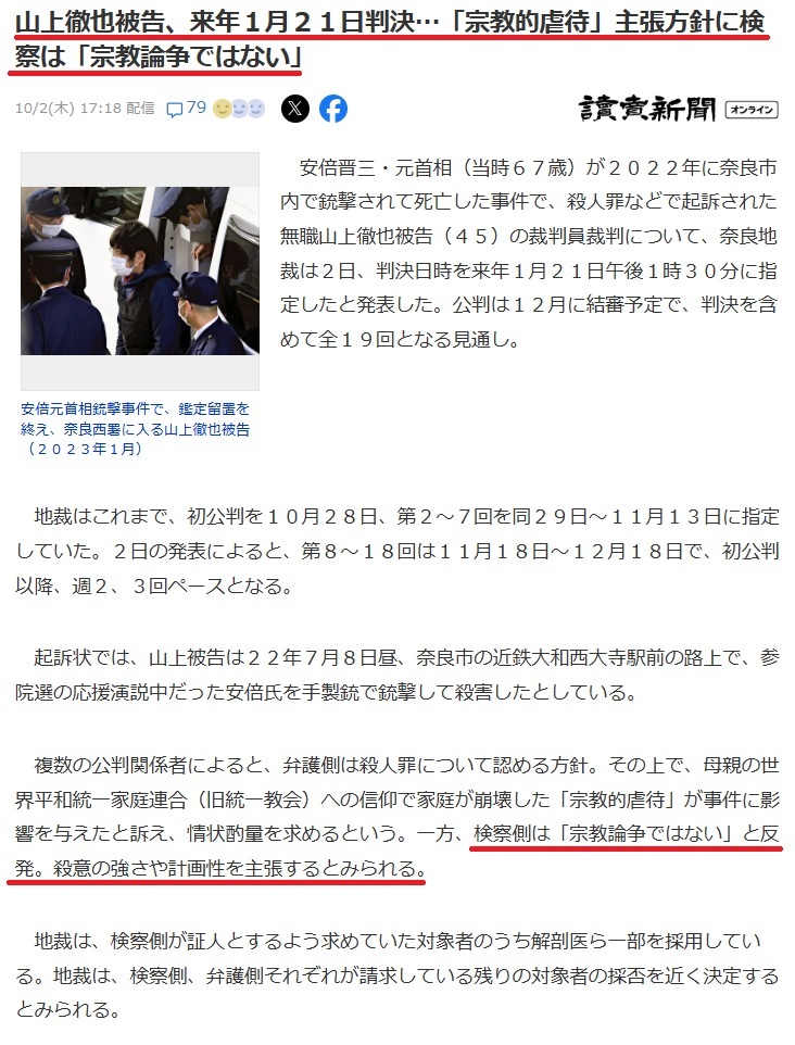 山上徹也被告、来年1月21日判決…「宗教的虐待」主張方針に検察は「宗教論争ではない」 2025/10/02 yomiuri.co.jp/national/20251… #自民党と統一教会の解体を求めます #統一教会 #創価学会 #幸福の科学 #カルト #政教分離違反 pic.x.com/RWzkJFqJX2