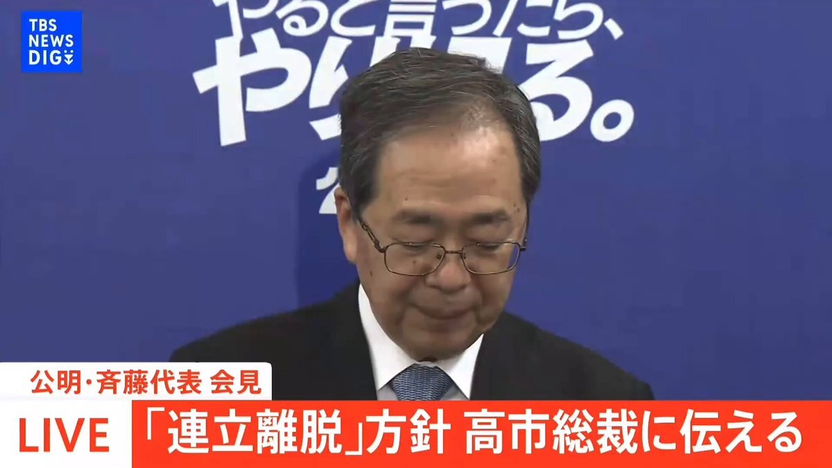 <公明党連立解消>公明党の斉藤代表   「自民党との連立は一旦白紙に戻します」 「首班指名では“斉藤鉄夫”と投じます」 「自民党候補への推薦も出しません」