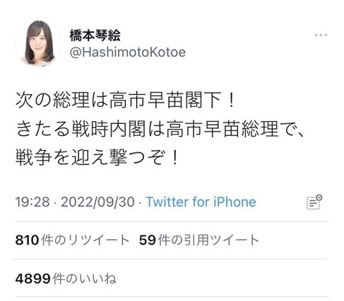 返信先:@takaichi_sanae#橋本琴絵 とかいうクソ女 戦争やりたがってるぞ、おい!! #安倍晋三 も戦争やりたがってたもんな 安倍晋三の意思を受け継ぐ #高市早苗 も戦争をやるってかクソ野郎 #自民党 #自民党政権が日本を滅ぼす x.com/3h_aki/status/…