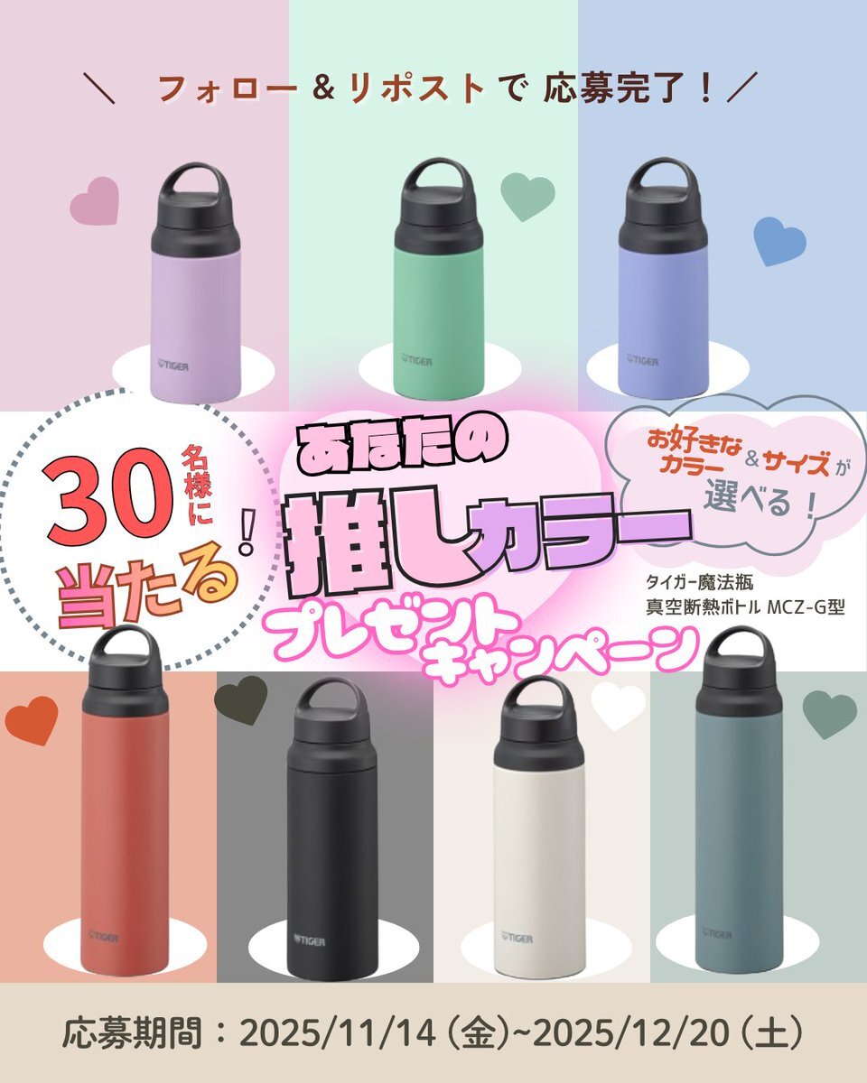 ⋰ 推しカラーが選べる!💖 ⋱ フォロー&リポストで応募完了🎯💫 タイガー魔法瓶「真空断熱ボトル〈MCZ-G型〉」 推しカラーが選べる🎁 プレゼントキャンペーン開催! 抽選で30名様にプレゼント🎉 🐯プレゼント内容 真空断熱ボトル〈MCZ-G型〉 お好きなカラー&サイズをお選びいただけます✨
