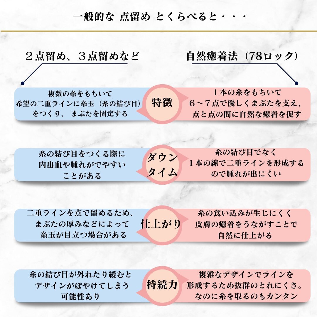 【執刀医】幡手医師 【内容】二重埋没:78ロック法 【価格】¥250,000 【概要】 一般的な点留めに比べ7点で固定する埋没法。点と点の間の癒着が促されることで従来より安定し取れにくい。二重ラインがぼやけにくく、もとから二重だったかのような自然な二重がつくれる。 #自然癒着法 #銀座 pic.x.com/K3D1O8ikgR