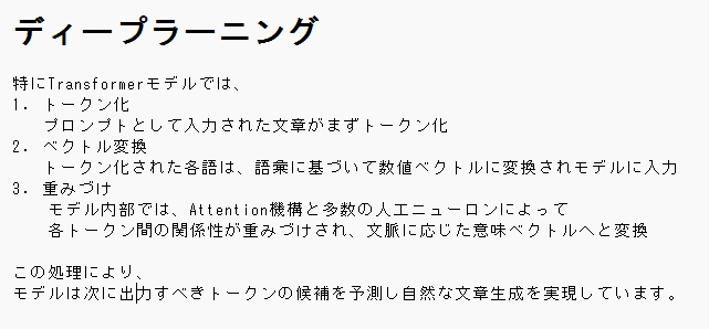 Transformerモデルでは、入力文をトークン化→ベクトル化し、Attentionとニューロンが文脈を理解して次の語を予測。これが自然な文章生成の仕組み。 ざっくりディープラーニングの利用されている 3.はこんな理解 #AI #ディープラーニング #自然言語処理 #Transformer pic.x.com/djLTi3DqLB