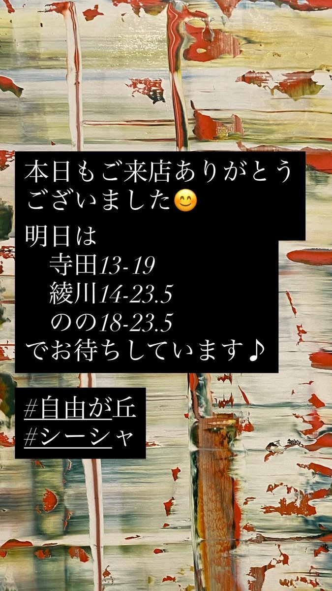 本日もご来店ありがとうございました😊 明日は  寺田13-19  綾川14-23.5  のの18-23.5 でお待ちしています♪ #自由が丘 #シーシャ pic.x.com/xgpffg8Fel