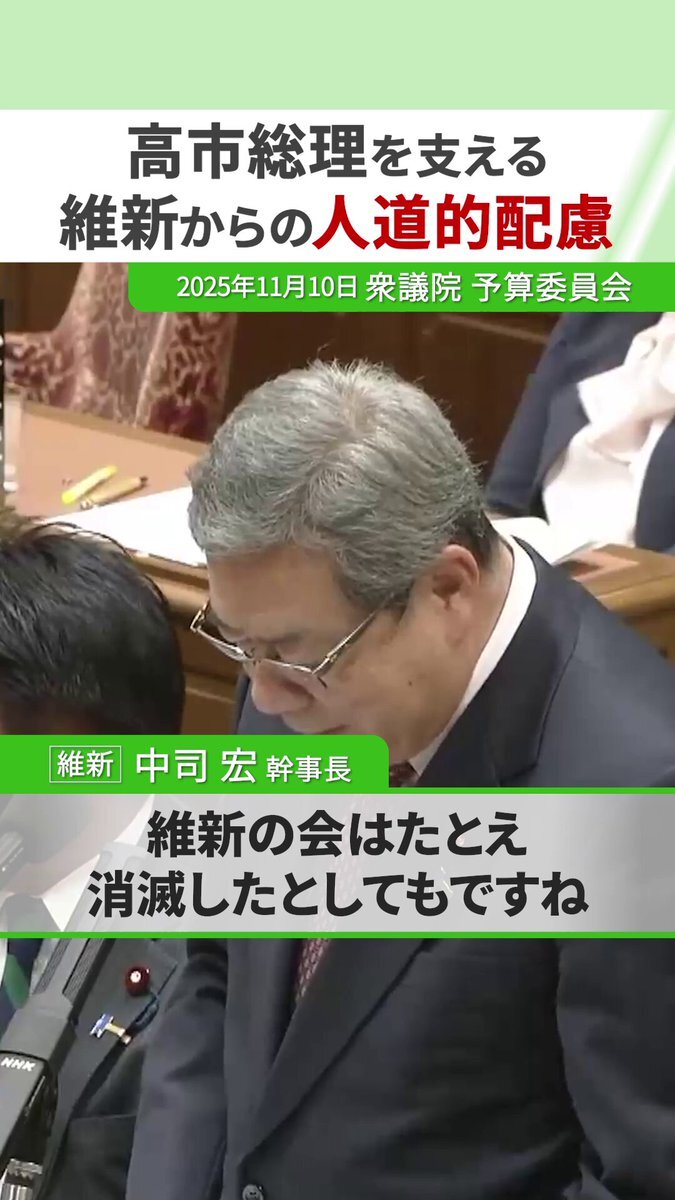 【 高市総理を支える維新からの人道的配慮 】 2025年11月10日 衆議院 予算委員会 日本維新の会 幹事長 #中司宏 維新の会はたとえ消滅したとしてもですね、果敢に今やるべきことに挑戦をしていく。 そういう愚直な政策集団でありますのでここまで突き進んできたのであります。