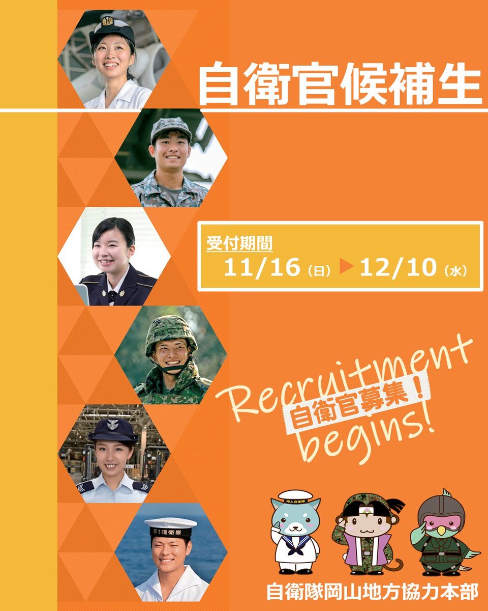 \📢 #自衛官候補生 受付開始📢/ 任期制の #自衛官 ( #特別職国家公務員 )になるための制度です🌸 18~32歳以下の方が受験可能です✍ 申込み〆切➡12/10(水) 採用試験についての詳細・お問い合わせはこちら👇 または、 #岡山ちほん 各募集事務所まで☺ mod.go.jp/pco/okayama/ pic.x.com/h3coStgTVH