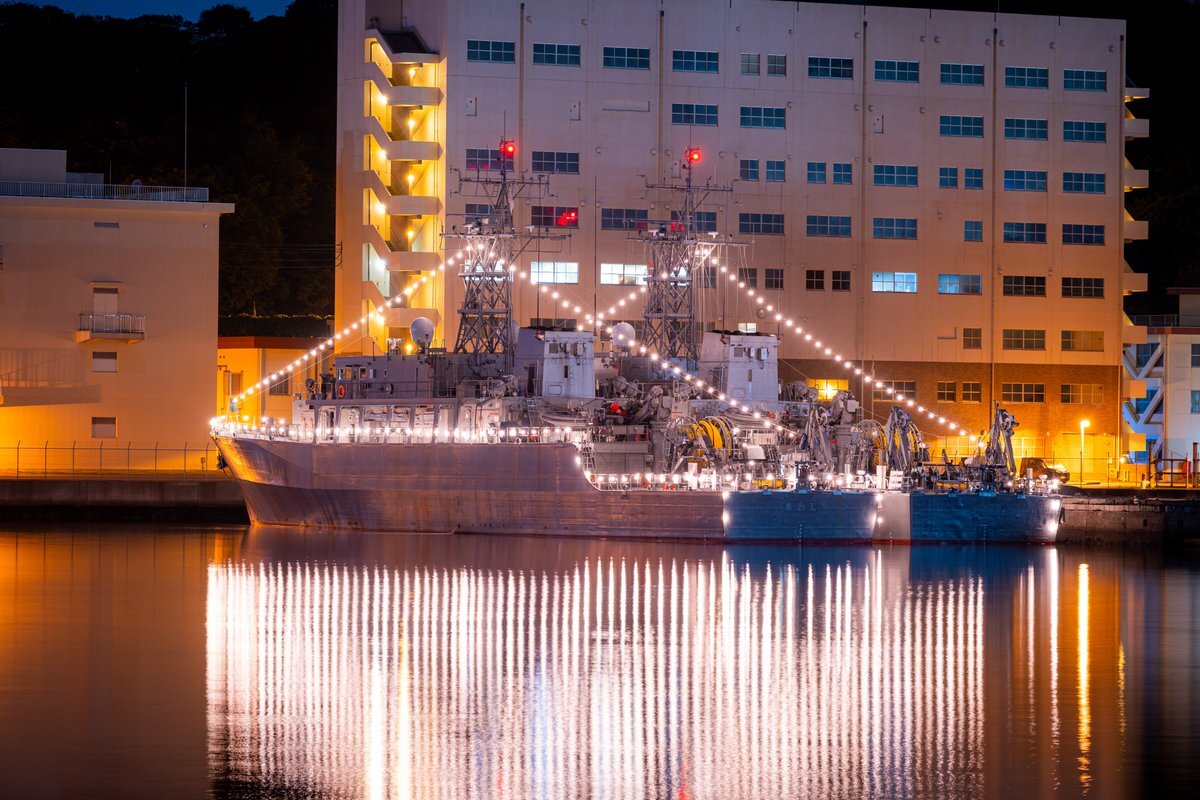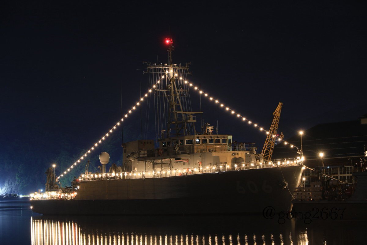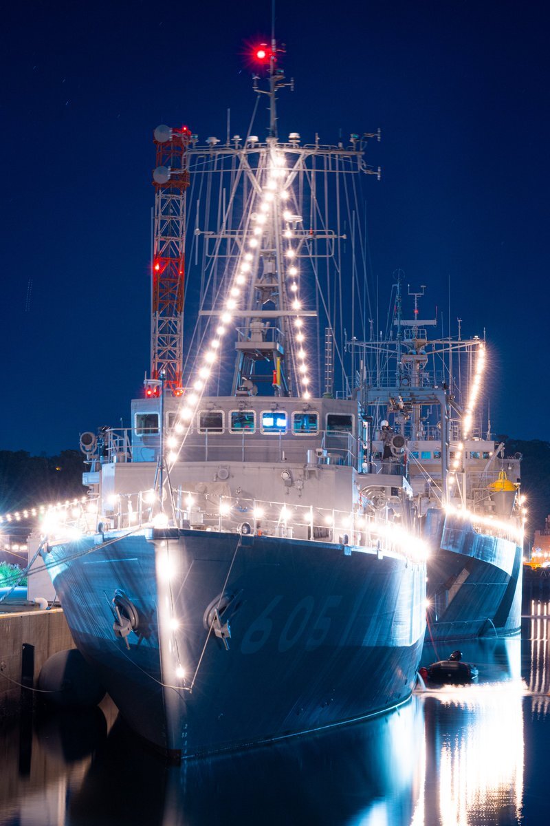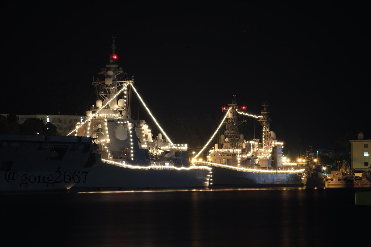 #自衛隊記念日 #ナイトクルーズ #艦船めぐり ナイトクルーズは電飾はモチロンなんですが点灯前の雰囲気も凄く好きです 2枚目の白い2つの光は「によど」の後部です 明るい!! このナイトクルーズでは「くれない5」も電灯艦飾になってます☺️イツモアリガトウ pic.x.com/4KupePUKNX