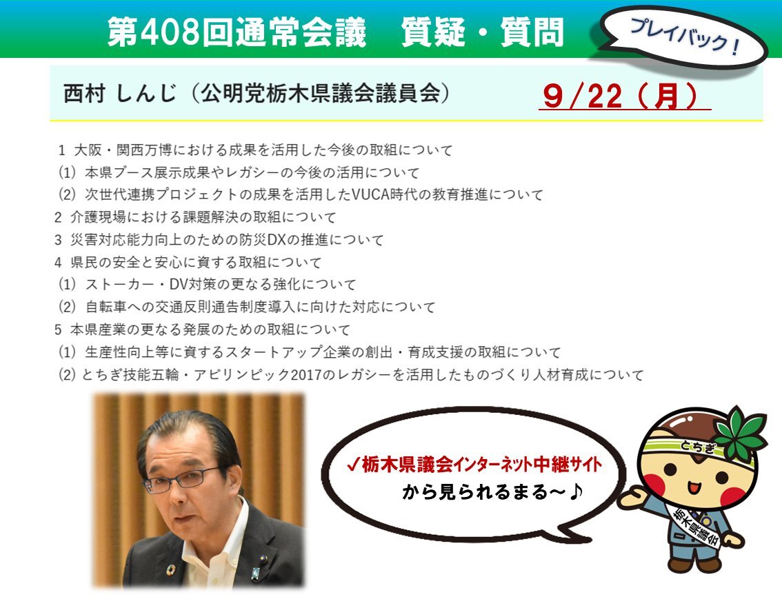 \#県議会とちまるくん の #第408回通常会議 プレイバック📱/ 9/22(月)に行われた西村しんじ議員の一般質問はこちらからご覧になれます。 #大阪・関西万博 #VUCA #防災DX #ストーカー・DV対策 #自転車青切符 #スタートアップ #技能五輪 #栃木県議会 smart.discussvision.net/smart/tenant/p… pic.x.com/E6Or7gGrmj