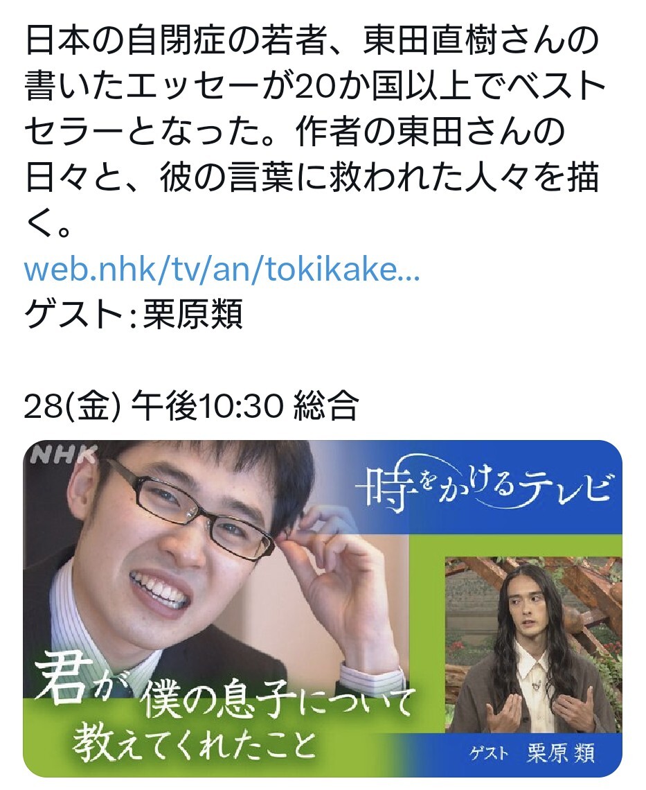 本日28(金) 午後10:30 総合 放送 このドキュメンタリーがきっかけで、息子とのやり取りが変わりました 暗闇を生きるような気分になる時もありますが、この番組を見てる間だけでも光を感じれたらいいな、と🙏✨ #自閉症 #自閉症スペクトラム pic.x.com/8P4m696HMW