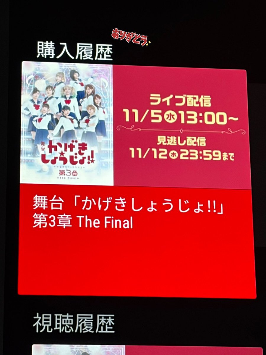 舞台「かげきしょうじょ!!」 第3章 The Final 配信まもなく終了✨ 大好評の中幕を閉じた #舞台かげき の配信視聴間も無く終了! チケット販売は、11/12(水)20:00まで! ご視聴は11/12(水)23:59まで可能です🌟 🌹配信ページ live.tv.rakuten.co.jp/content/521364/