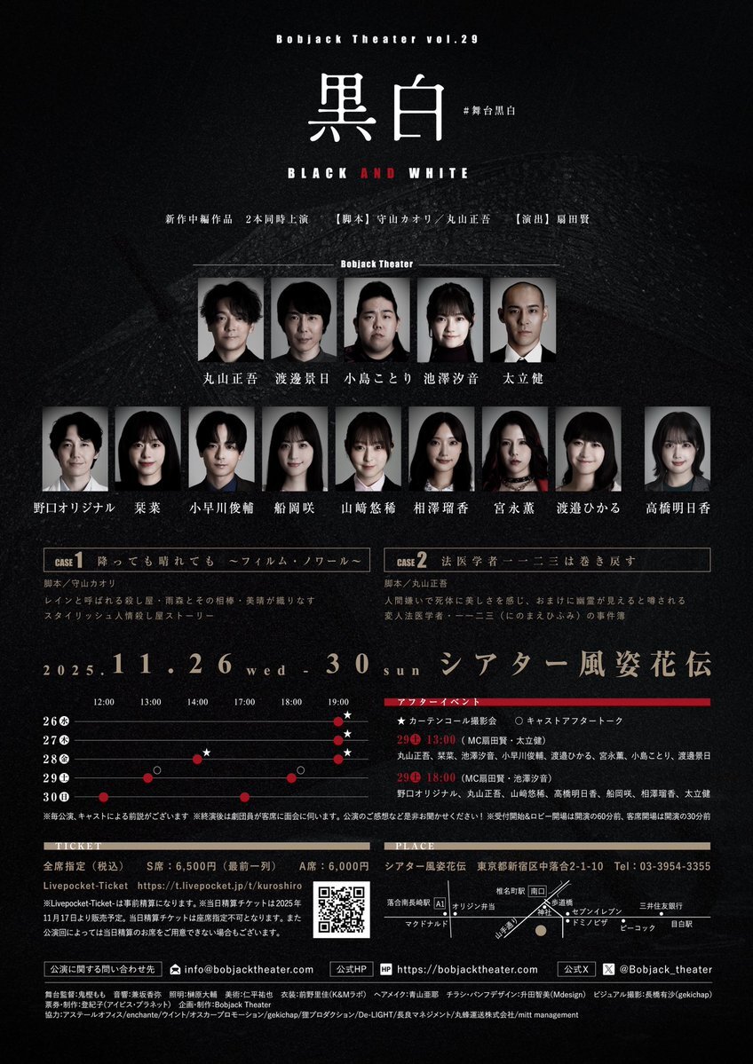 Bobjack Theater vol.29 『黒白』 脚本 守山カオリ/丸山正吾 演出 扇田賢 2025年11月26日(水)〜30日(日) @シアター風姿花伝 🎟️事前精算 t.livepocket.jp/t/kuroshiro 🎟️当日精算 ticket.corich.jp/apply/396458/1… 💌応援メッセージ bobjacknet.thebase.in/items/124386789 #舞台黒白 pic.x.com/3yS6azJRQd