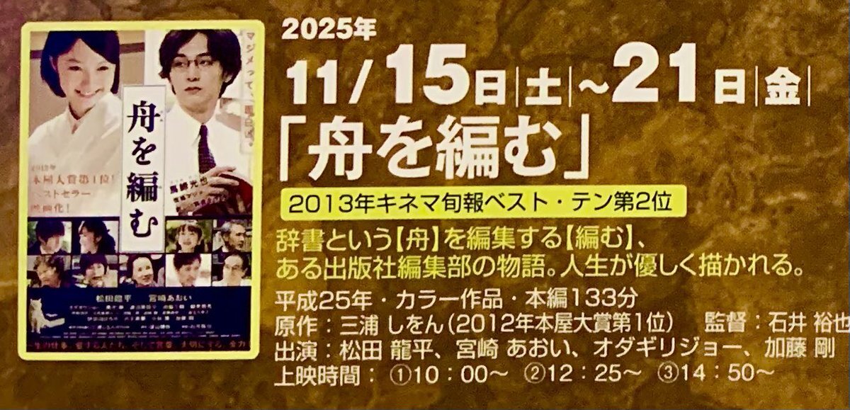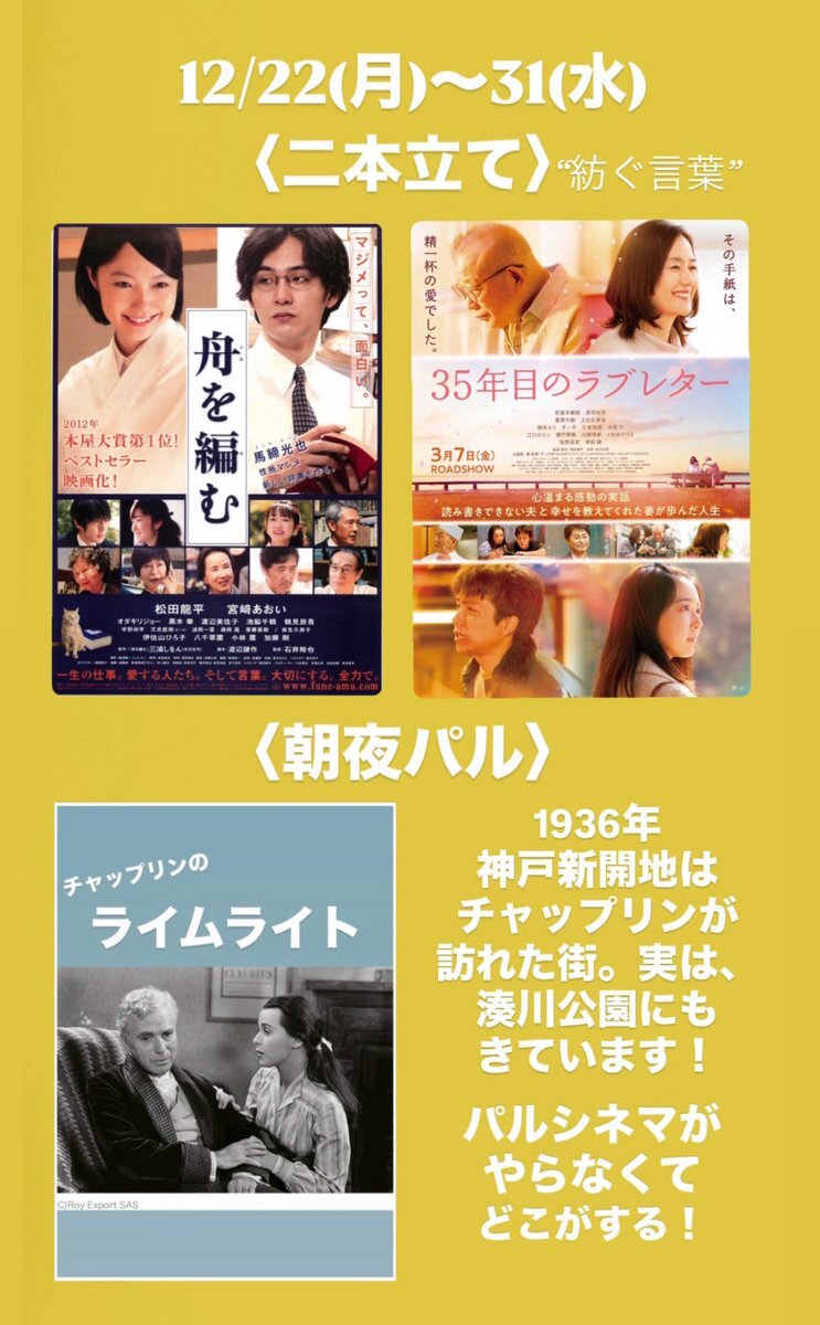 12/22(月)〜31(水) ~紡ぎたかった言葉~ 〈2本立て〉 『#35年目のラブレター』 読み書きができない夫と幸せを教えてくれた妻の人生を描く実話 『#舟を編む』 辞書を作る男が愛を伝える言葉を探す 〈朝/夜パル〉※特別料金 『#ライムライト』 チャップリン不朽の名作 pic.x.com/oXb7YuiHgw