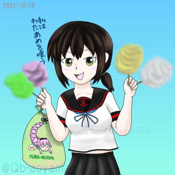 ワンドロチャレンジ(60分ジャスト)。 前に描いた「わたあめ大好き」ネタからやっぱりこれかなと、#艦娘達が何か喰う絵を載せよう で。 カラーわたあめってあったかな… #艦これ版真剣お絵描き60分一本勝負 #艦これ版真剣お絵描き60分一本勝負_20251012 #吹雪 pic.x.com/HIoc7qhsTv