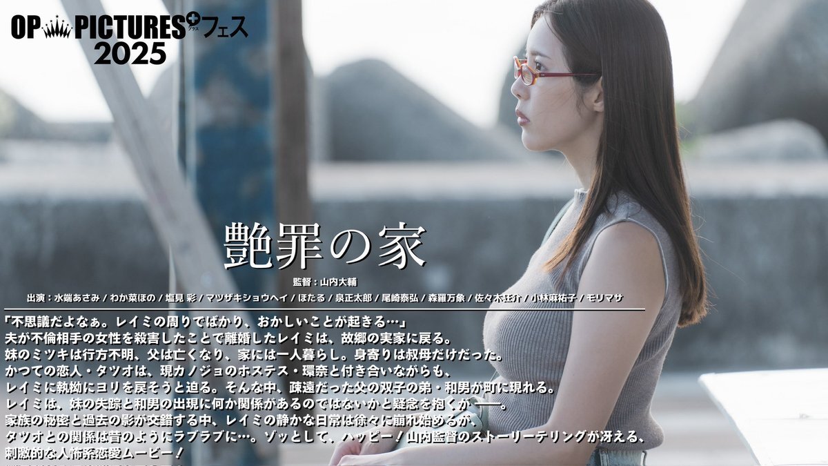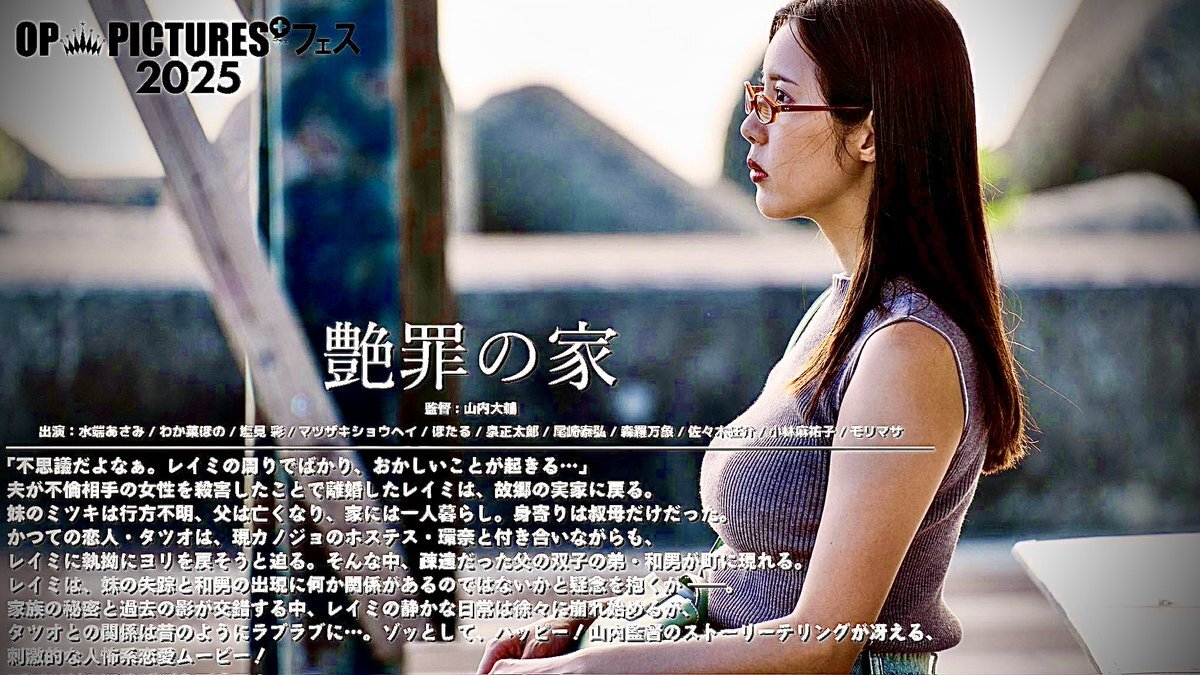 #OPフェス2025「#艶罪の家」鑑賞。とある女の前から浮気した夫や寝とられた妹が消えていくが。山内大輔監督らしいホラー感漂うシュールな世界を楽しんだ。塩見彩さんの表情が作品にあって好演だし、わか菜ほのさんも印象に残る。水端あさみさんも良かった。カラコレでの独特な色味やノイズが興味深い。 pic.x.com/jwXIrlBojN