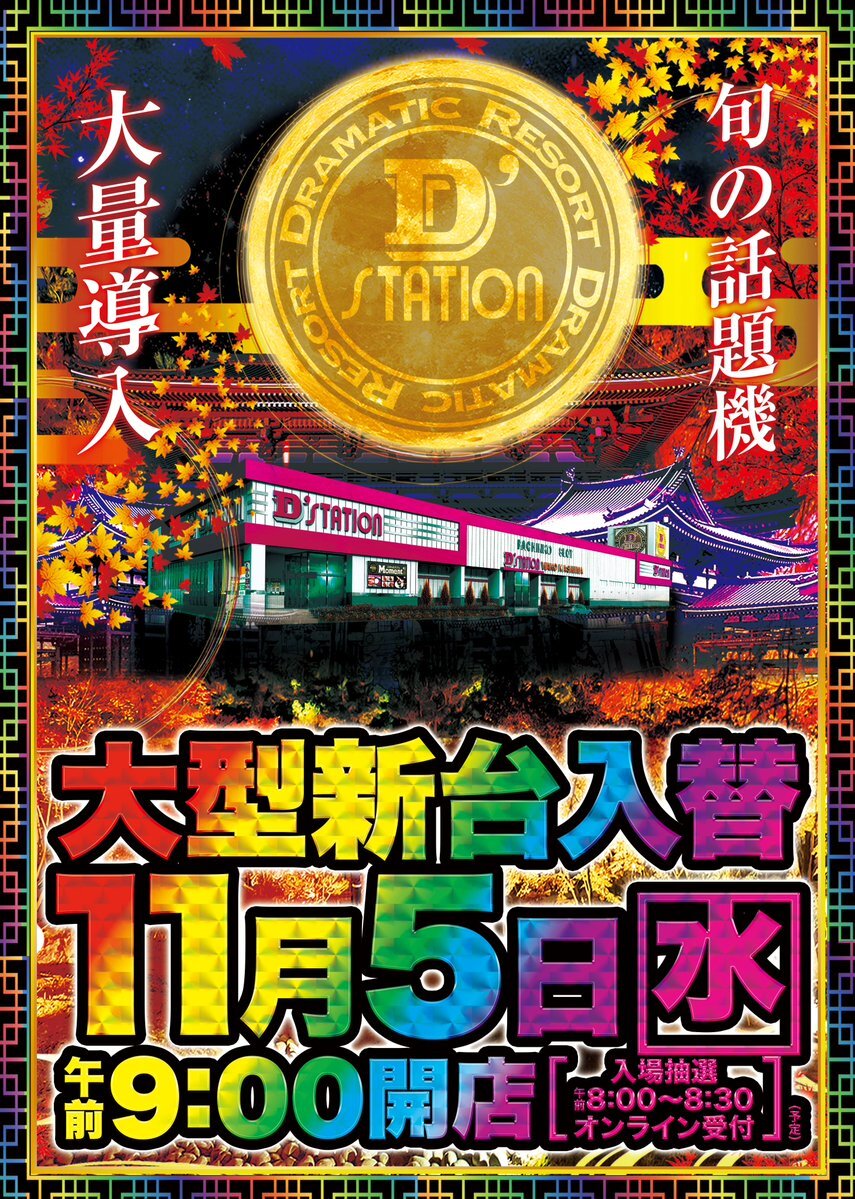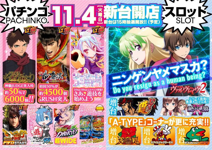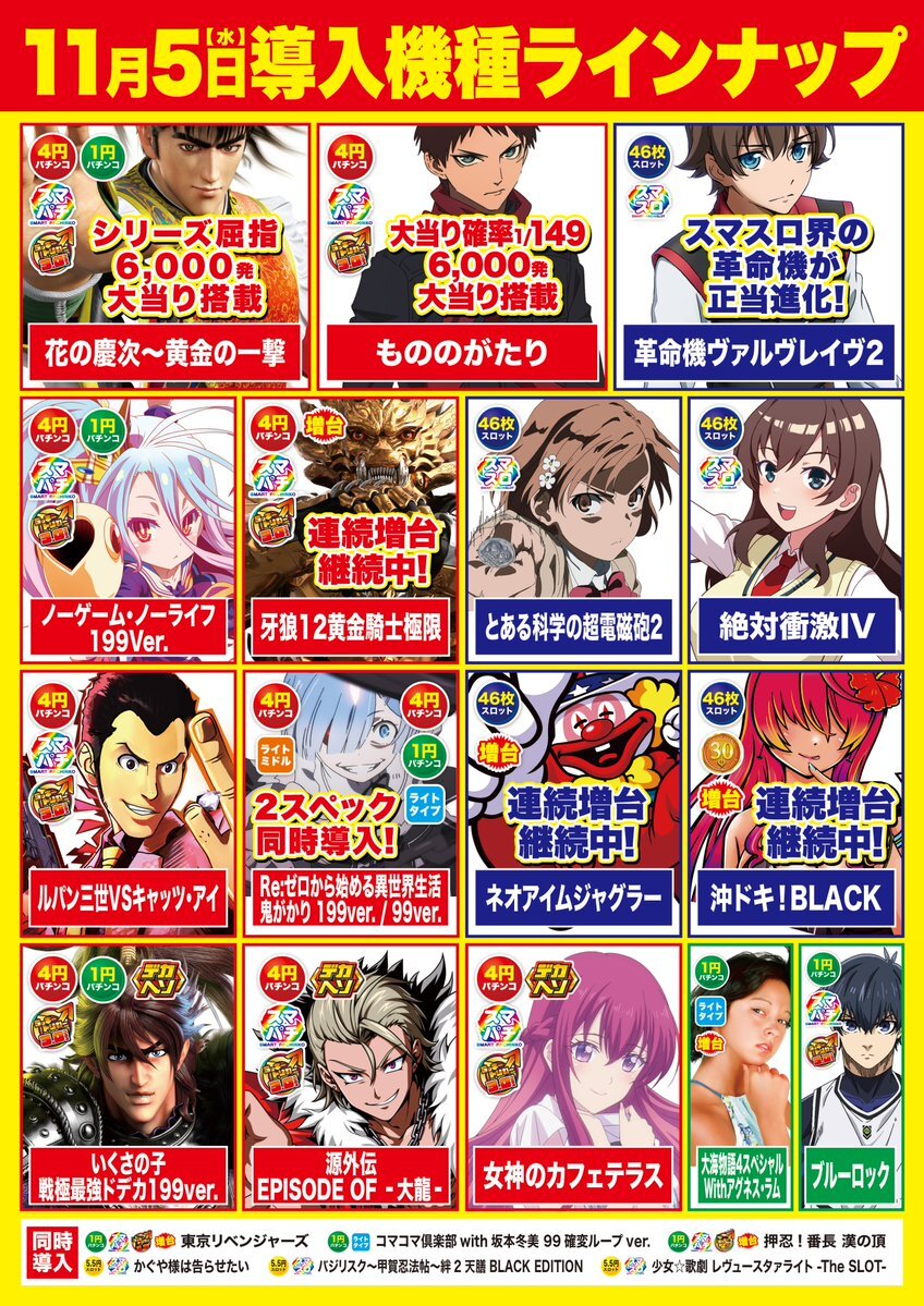 11月5日(水)大型新台入替🌈 最新台のご案内です🆕 スロット最新作🪙 #ヴァルヴレイヴ2 ⚔️ #とある科学の超電磁砲2 ⚡️ #絶対衝激4 👩👧👧 #沖ドキBLACK 🌺増台! パチンコ最新作 #もののがたり 🧣 #花の慶次黄金の一撃 🌸 #リゼロ鬼がかり 🐋 ライトミドルと甘デジの2種類が同時に登場! pic.x.com/yPhVWRIK9i
