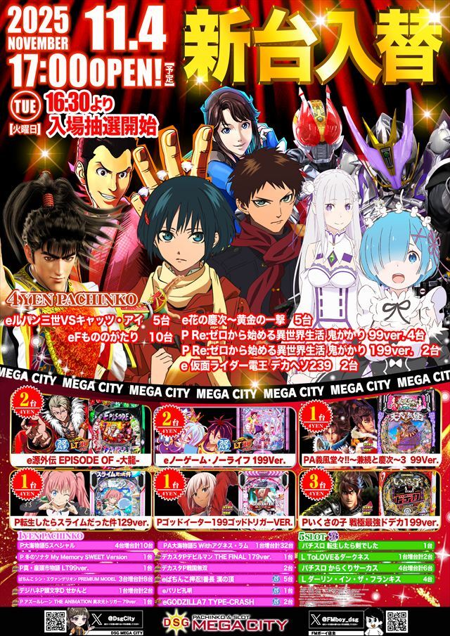 今週は新台入替WEEK🔥 始まりはパチンコ館から🎶 本日P館新台入替17時OPEN予定 👑👑👑👑👑👑👑 #花の慶次黄金の一撃 #もののがたり #ルパンVSキャッツアイ ・・・などなど 一挙12機種導入予定~👍👍👍 この後16時30分から 入場抽選開始予定‼️ 最新台はメガシティでっ‼️‼️ #新台入替 #DSGメガシティ pic.x.com/Dks30EzIoY