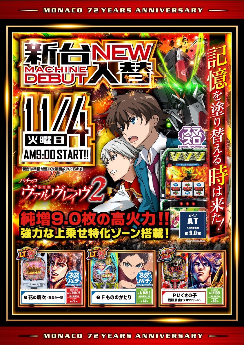 おはようございます!! 11/4新台入替のお知らせです💡 #革命機ヴァルヴレイヴ2 #花の慶次黄金の一撃 #もののがたり #いくさの子ドデカ さあ! 三連休も腕振ってがんばるぞ✊ pic.x.com/63AXASsDKr