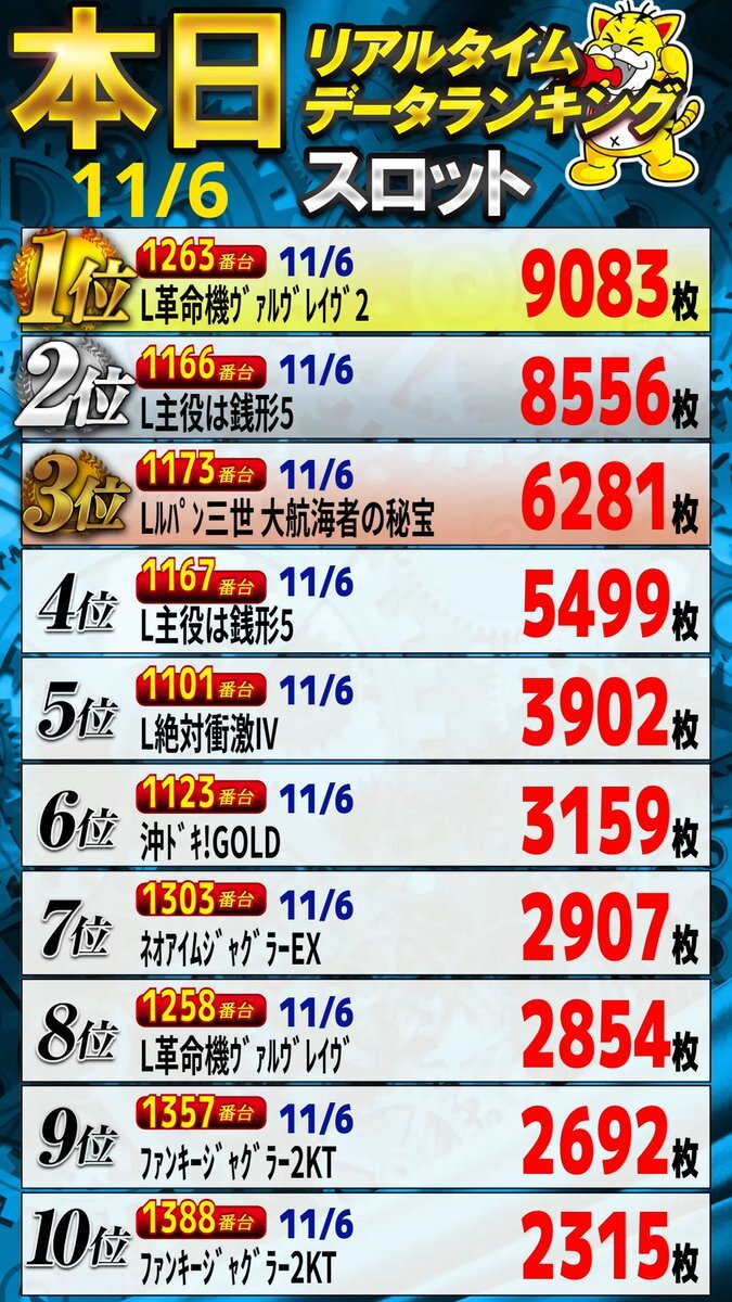 ✨新台入替②日目✨ 昨日は開放初日から最新台が 出玉ランキングを総なめ👑 #花の慶次黄金の一撃 #もののがたり #ルパンVSキャッツアイ #源外伝 #仮面ライダー電王 更に話題のスロット最新台✨ #ヴァルヴレイヴ2 からも万枚over🎊 5,000枚overは合計6台🎉 本日もモチロン夜の王者が魅せる pic.x.com/bb6PHmr52y x.com/gene_kyobashi/…
