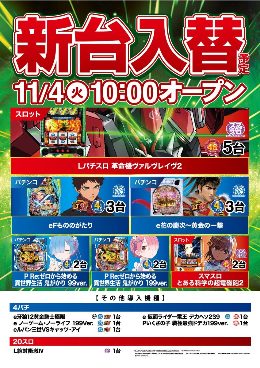あしたは《新台入替》だぉ💪🔥 台がい~~~~っぱいあるから いまのうちに盃(さかずき)かわそ~🦔🦔 #花の慶次黄金の一撃 #いくさの子 #もののがたり #ノゲノラ #源外伝 #ファインプレー #ヴヴヴ2 #超電磁砲2 #絶対衝激4 #11月4日 pic.x.com/ScTvrzQemL x.com/ZIATH_Shinyuri…