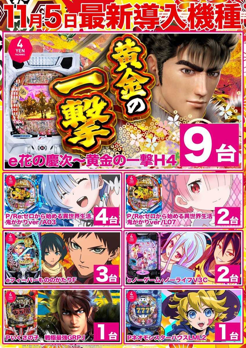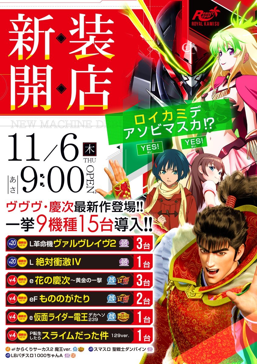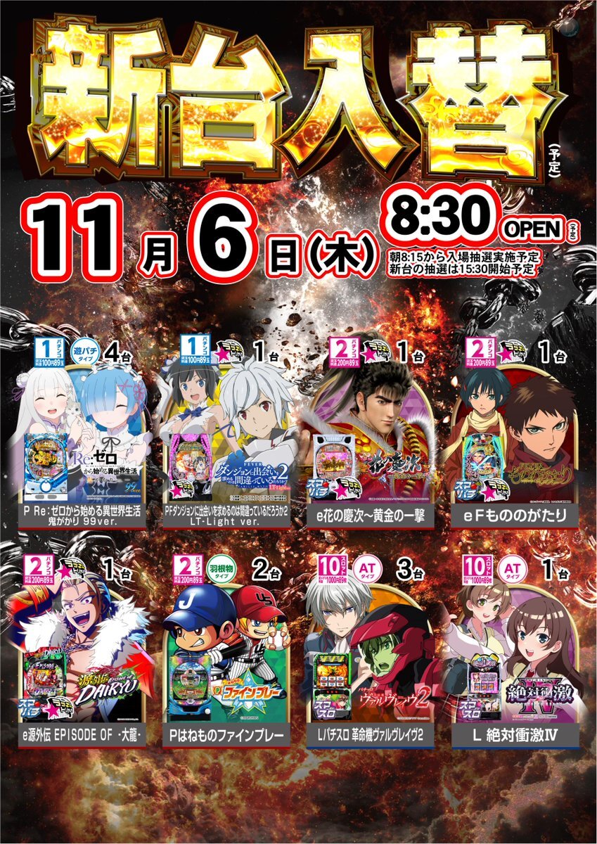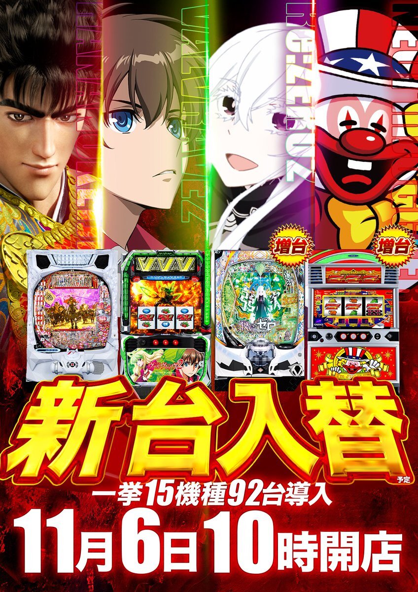 #ダイナム #新台入替 🌟🌟新台入替🌟🌟 11月6日(木)開催! 1パチンコ #Reゼロ鬼がかり99ver なんと4台! 他1機種 2パチンコ #花の慶次~黄金の一撃 他3機種 10スロット #ヴァルヴレイヴ2 10スロで打てる! 他1機種 全8機種計14台‼️ お待ち致しております pic.x.com/IPYN8SrGbG